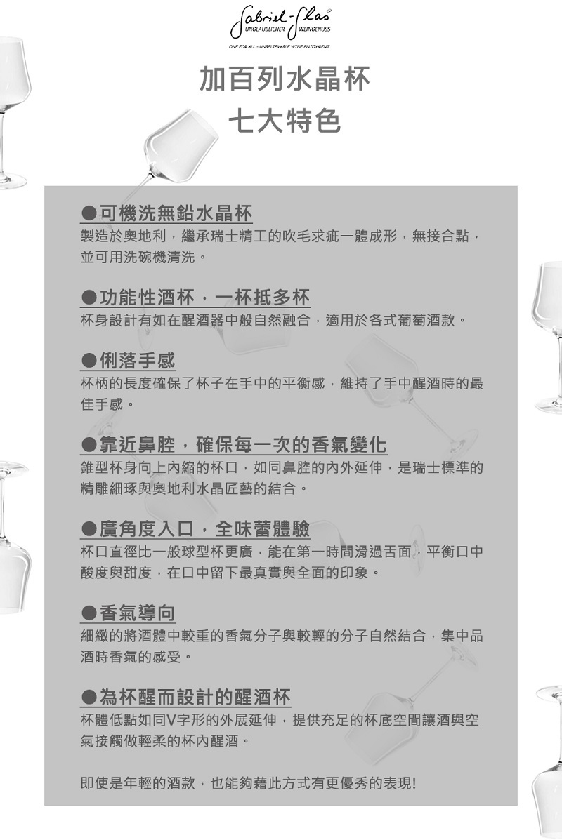 .藉由大面積杯底,提升葡萄酒與空氣的接觸面積,藉此突顯酒體香氣的層次